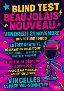 Prochaine animation, Blind Test Beaujolais nouveau, vendredi 21 novembre à partir de 19h à la salle des fêtes de Vincelles. Attention, sur inscription au 06 95 19 92 70